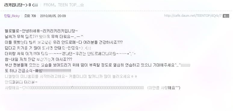 [틴탑] 100805 Ricky FAN CAFE 留言
